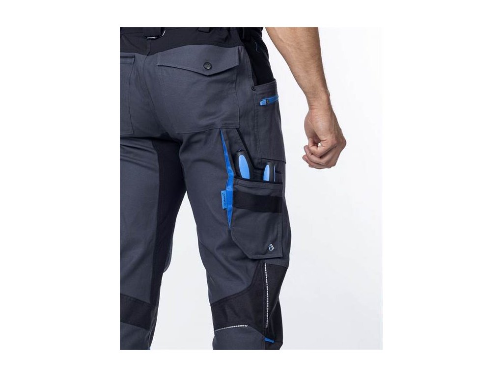 Nesmie chýbať aj niekoľko praktických vreciek, D krúžok pre karabíny, rovnako ako bezpečnostné reflexné pásky a hi-vis doplnky. Štýl aj funkčnosť strečových nohavíc perfektne doplní pracovná blúza rovnakej farby.