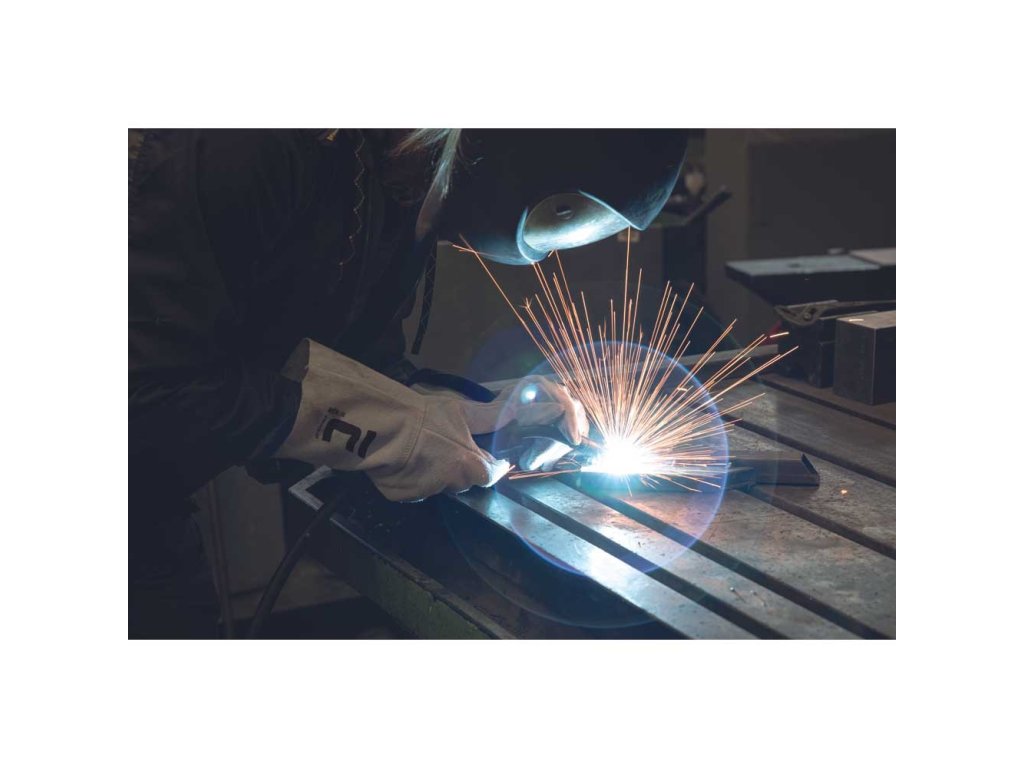 Zdvojená dlaň zo šedej a zelenej hovädzej štiepenky, chrbát a tuhá manžeta z bielej bavlnenej tkaniny, podšívka v dlani.