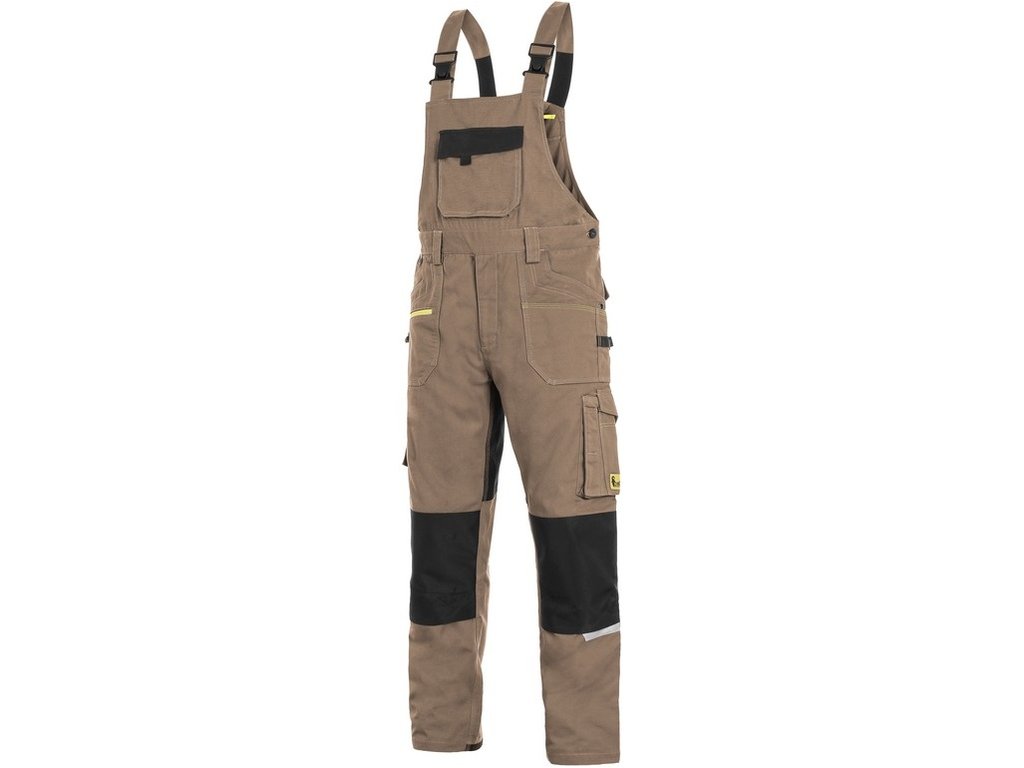 Pánske montérkové nohavice s náprsenkou, strečová tkanina umožňujúca voľný pohyb, náprsné vrecko s chlopňou, pás s pútkami na opasok, predné vrecká s vreckom na zips, dve zložky. vrecká - jedna s chlopňou, zadný spodný lem nohavíc vystužený 600D polyesterom, traky s gumou vzadu, reflexné doplnky. Odporúčané použitie: strojárstvo, stavebníctvo, ľahký priemysel, automobilový priemysel, logistika, skladová manipulácia, špedícia, autoservisy, údržba, montáže, poľnohospodárstvo, záhrada, hobby.