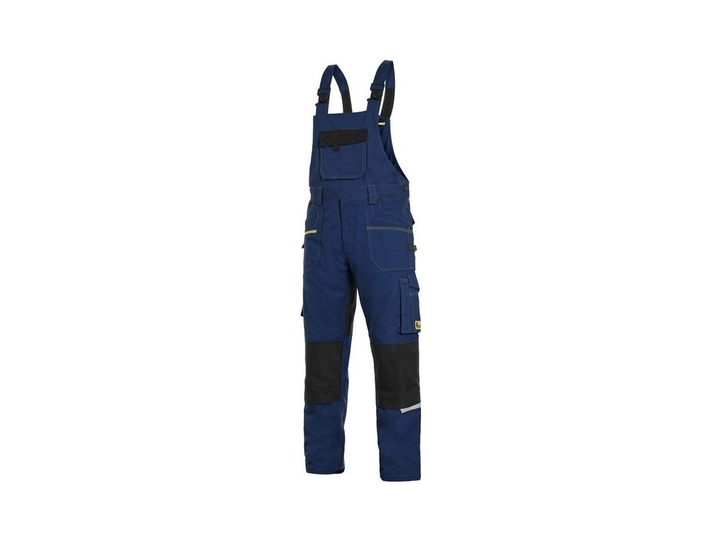 Pánske montérkové nohavice s náprsenkou, strečová tkanina umožňujúca voľný pohyb, náprsné vrecko s klopou, pás s pútkami na opasok, predné vrecká s vreckom na zips, multifunkčné vrecká na oboch stranách, kolená zosilnené 600D vice vystužený 600D polyesterom, traky s gumou vzadu, reflexné doplnky. Odporúčané použitie: strojárstvo, stavebníctvo, ľahký priemysel, automobilový priemysel, logistika, skladová manipulácia, špedícia, autoservisy, údržba, montáže, poľnohospodárstvo, záhrada, hobby. ové zloženie