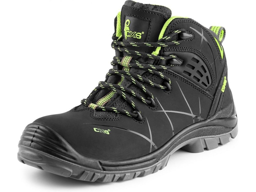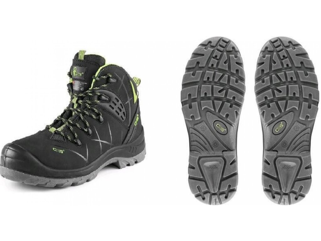 Kotníková bezpečnostná obuv, kožená, s plastovou špicou a kevlarovou stielkou, reflexné doplnky. Materiál: zvršok z 1,6 – 1,8 mm štiepkovej nubukovej kože (z jedného dielu), vonkajšia TPU ochrana päty, bez kovových súčastí, podšívka z priedušného oderu odolnej textílie, PU-PU olejovzdorná, antistatická, protišmyková podošva.