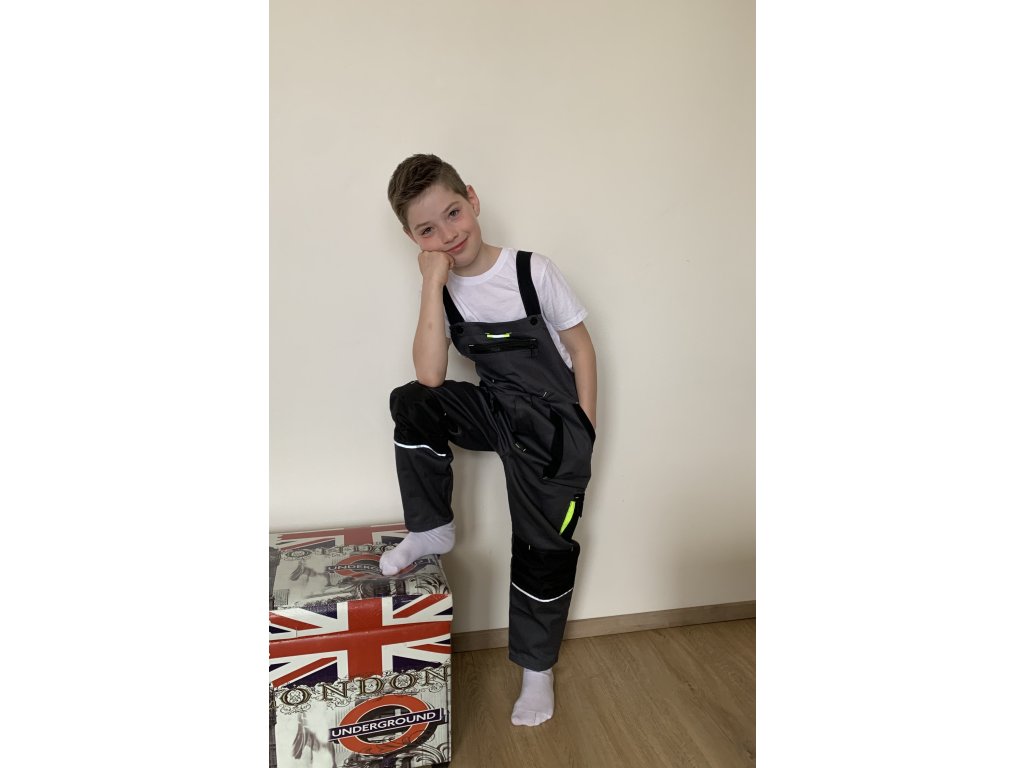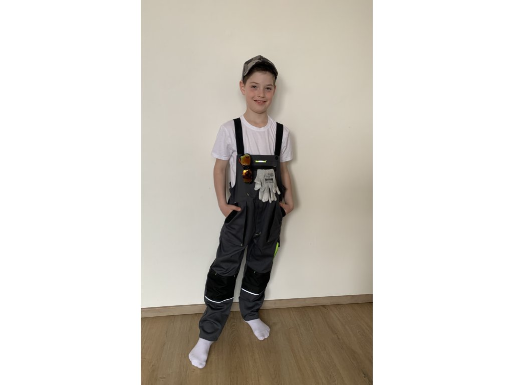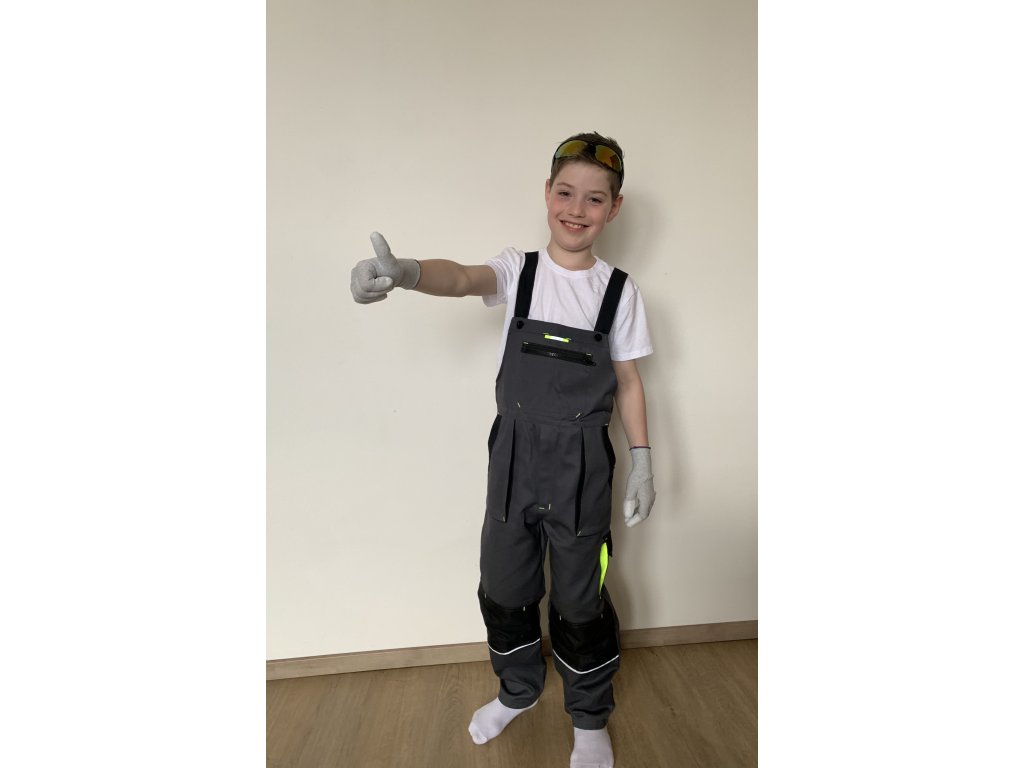 Detské nohavice s trakmi v šedej farbe s reflexnými pruhmi, zosilnené kolená. Nohavice sú v páse do gumy, bočné zapínanie na gombíky, nastaviteľné traky. Materiál 100% bavlna a 250g.