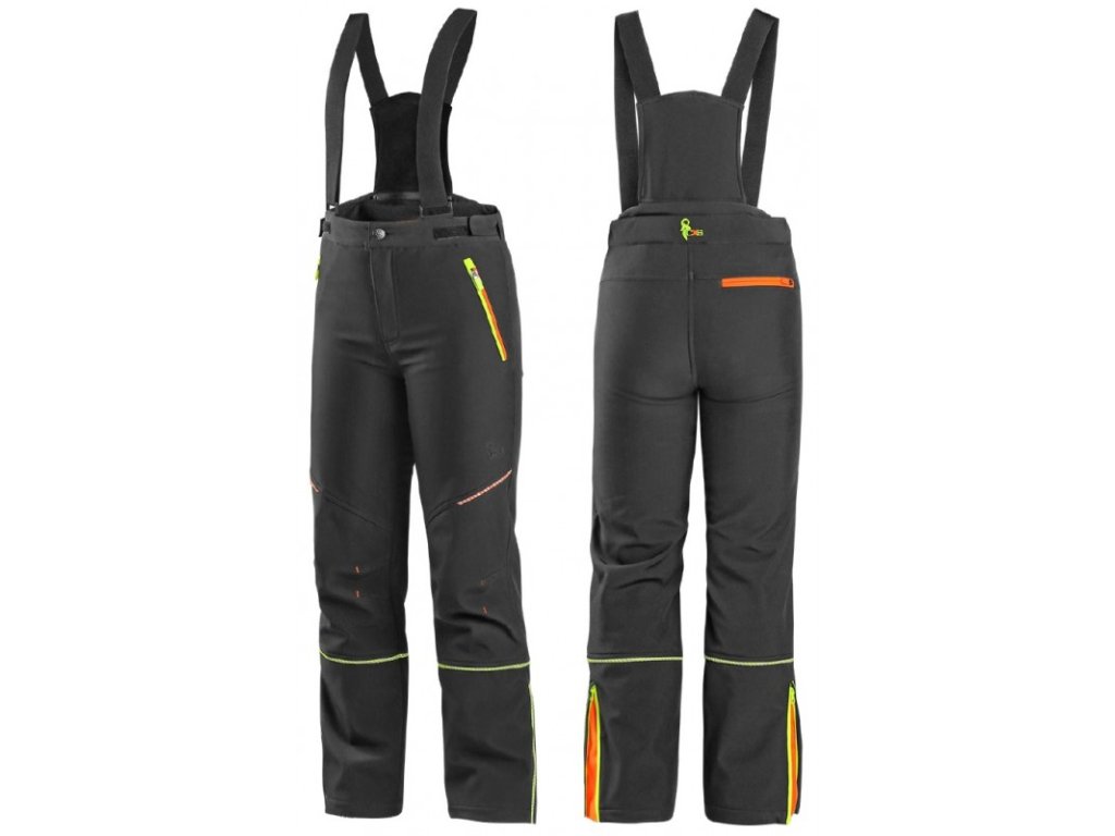 Detské softshellové nohavice pre voľný čas, odopínacie traky s nastaviteľnou veľkosťou, flexibilný pás s možnosťou upravenia veľkosti, 2 predné vrecká na zips, zadné vrecko na zips, zips dole na nohaviciach, vnútorné protisnežný pás v spodnej časti nohavíc, reflexný doplnok.