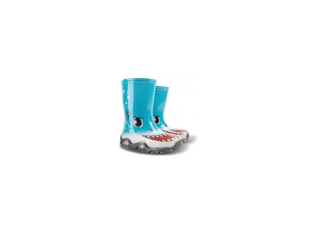 Detské farebné čižmy demar STORMER PRINT sú ideálne pre daždivé letné počasie. Farba holiniek modrá v prevedení žraloka. Majú hrubšiu protišmykovú podrážku zaisťujúcu bezpečnosť chôdze. Holinka je veľmi pohodlná a ľahká. Materiál je vysoko kvalitné a odolné PVC podšité príjemnou textíliou. Na päte obuvi je bezpečnostný reflexný pásik pre dobrú viditeľnosť dieťaťa v tme. Vyrobené v EÚ.
