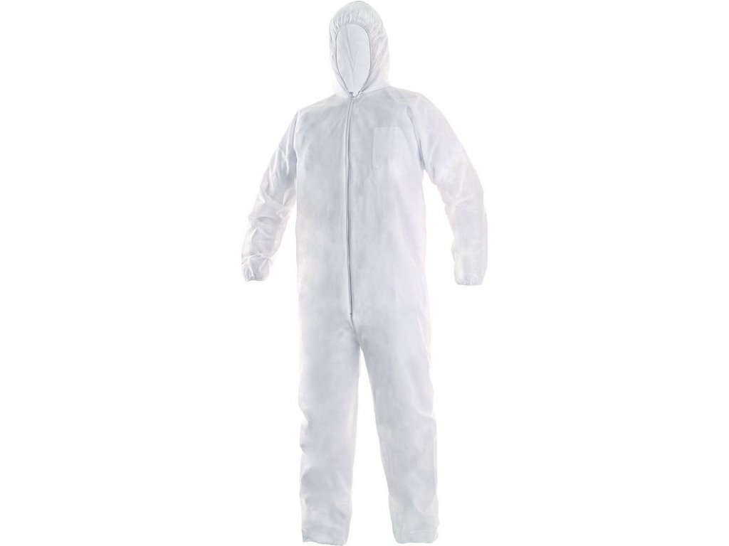 Jednorázový oblek z netkanej textílie, zapínanie na zips. Kapucňa, manžety rukávov a nohavice zakončené gumičkou. Chráni pred prachom a ľahkým zašpinením.