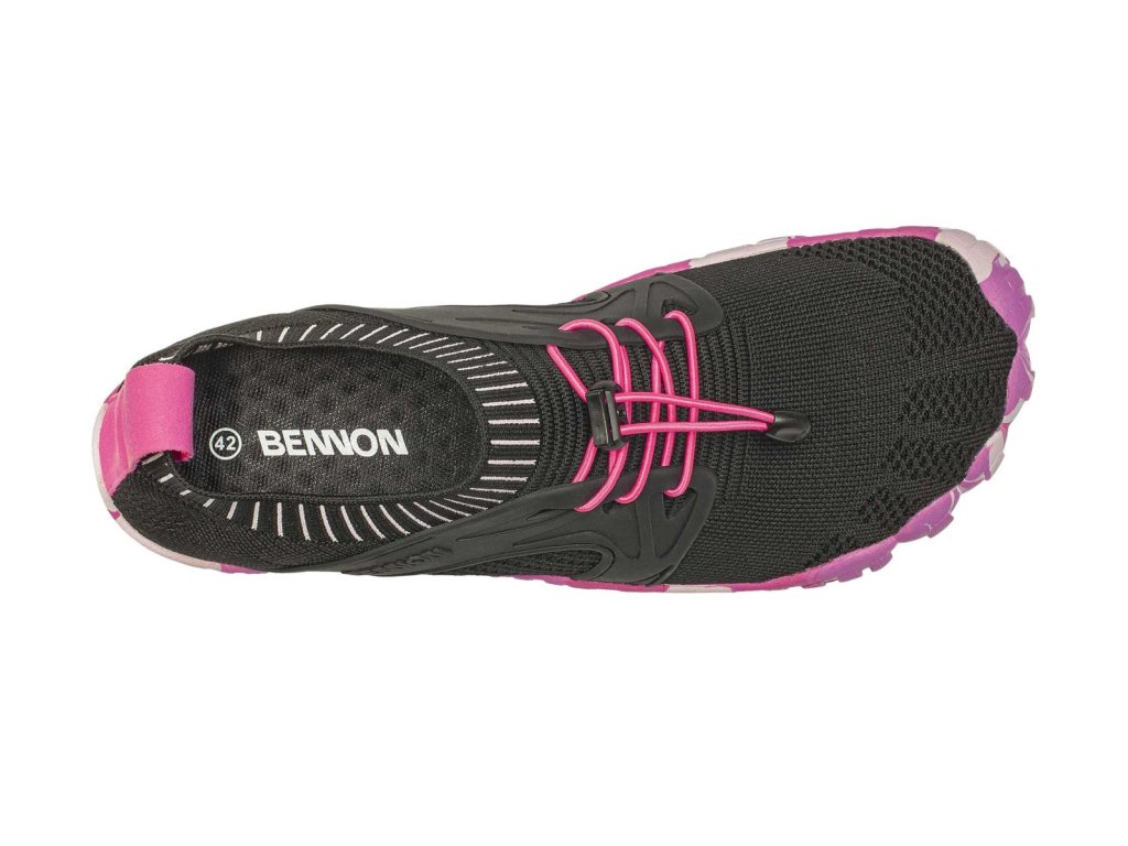 Voľnočasová obuv BENNON BOSKY BLACK/PINK BAREFOOT, alebo bosonožky. Obuv imituje chôdzu naboso. Obuv, pri nosení ktorej dochádza k relaxácii, aktivácii a posilneniu svalov chodidiel a lýtok. Zvršok topánok je priľnavý, priedušný a kopíruje prirodzený tvar chodidla, prsty tak majú dostatok priestoru, nie sú stláčané a deformované. Podošva guma BARE je pružná, cítite kontakt s terénom, jemne a prirodzene masíruje reflexné zóny. Vnútri topánok je tenká, vyberateľná stielka PU + MESH s ľahkým zosilnením materiálu v oblasti päty pre mäkší došľap, obuv je tak vhodná aj pre barefoot začiatočníkov. Jednoduché obúvanie.