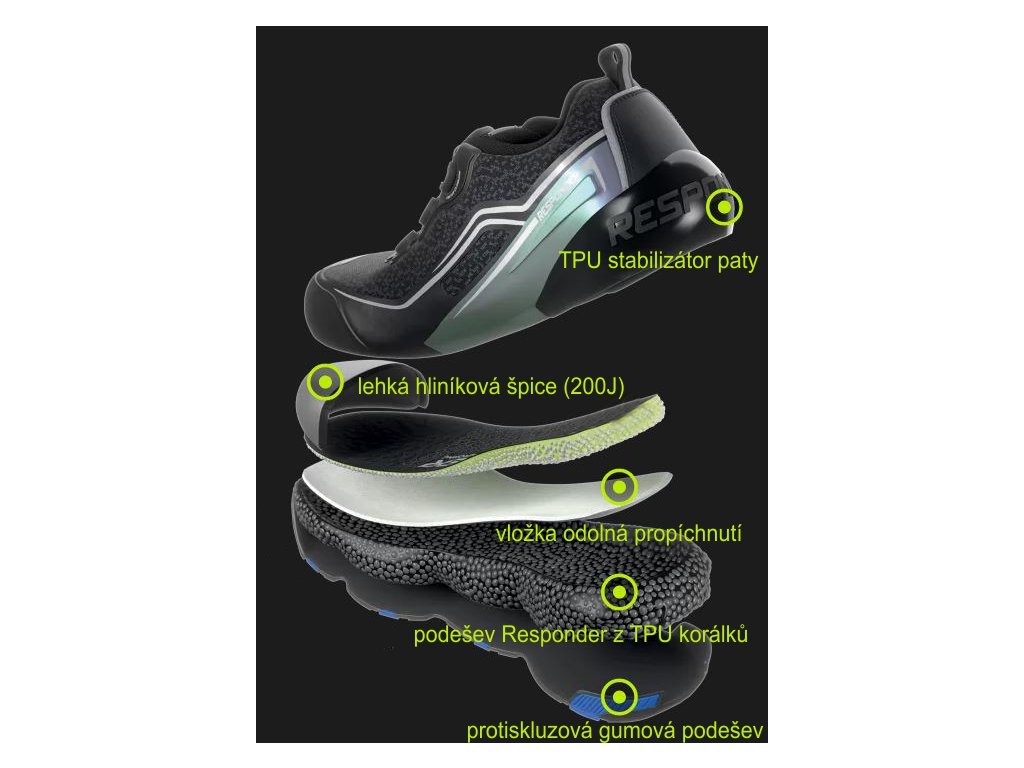 - Patentovaná technológia RESPONDER použitá v medzipodrážke a stielke poskytuje vynikajúce citlivé odpruženie, extrémnu ľahkosť a flexibilitu po celom povrchu nohy, čím zaisťuje vynikajúci výkon aj po dlhodobom a intenzívnom používaní.