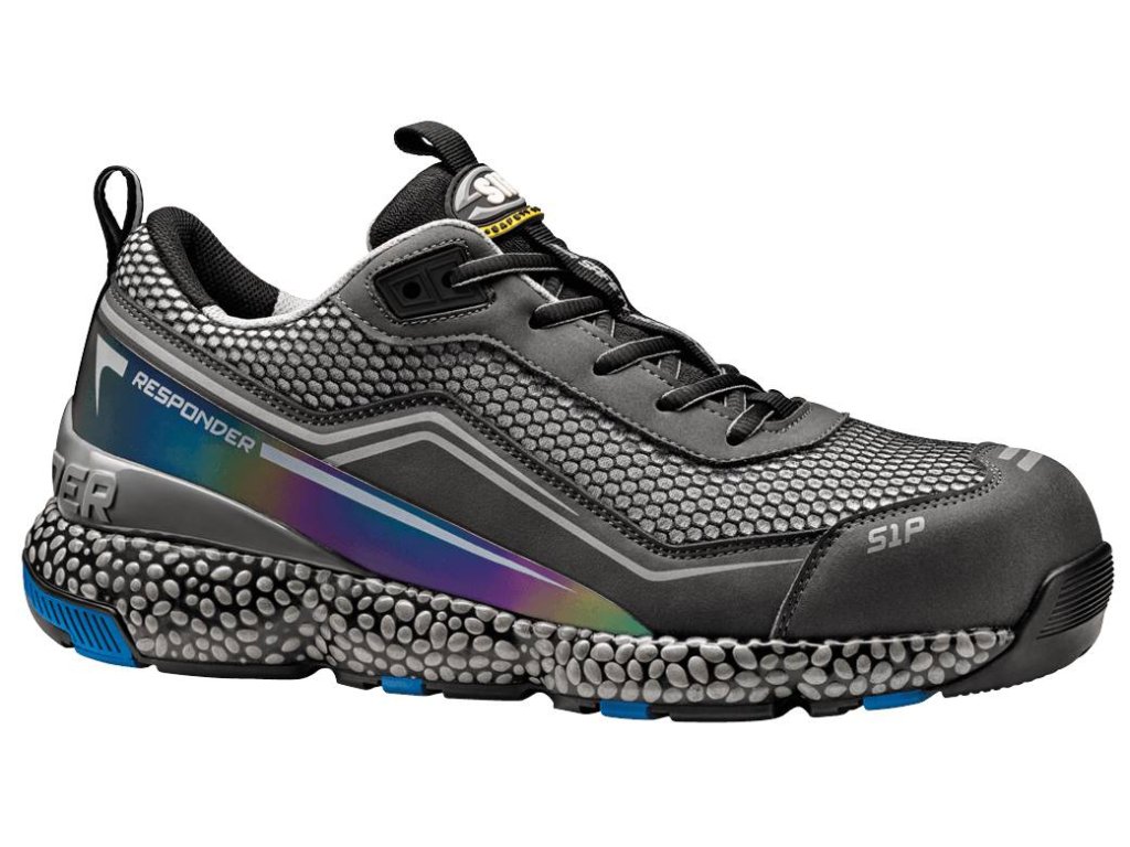 E-TPU Responder/gumová podošva poskytuje vynikajúcu elasticitu a tlmiaci efekt: medzipodrážka vyrobená z expandovaného termoplastického polyuretánu pokrýva celé chodidlo a ponúka flexibilitu a citlivé odpruženie.
