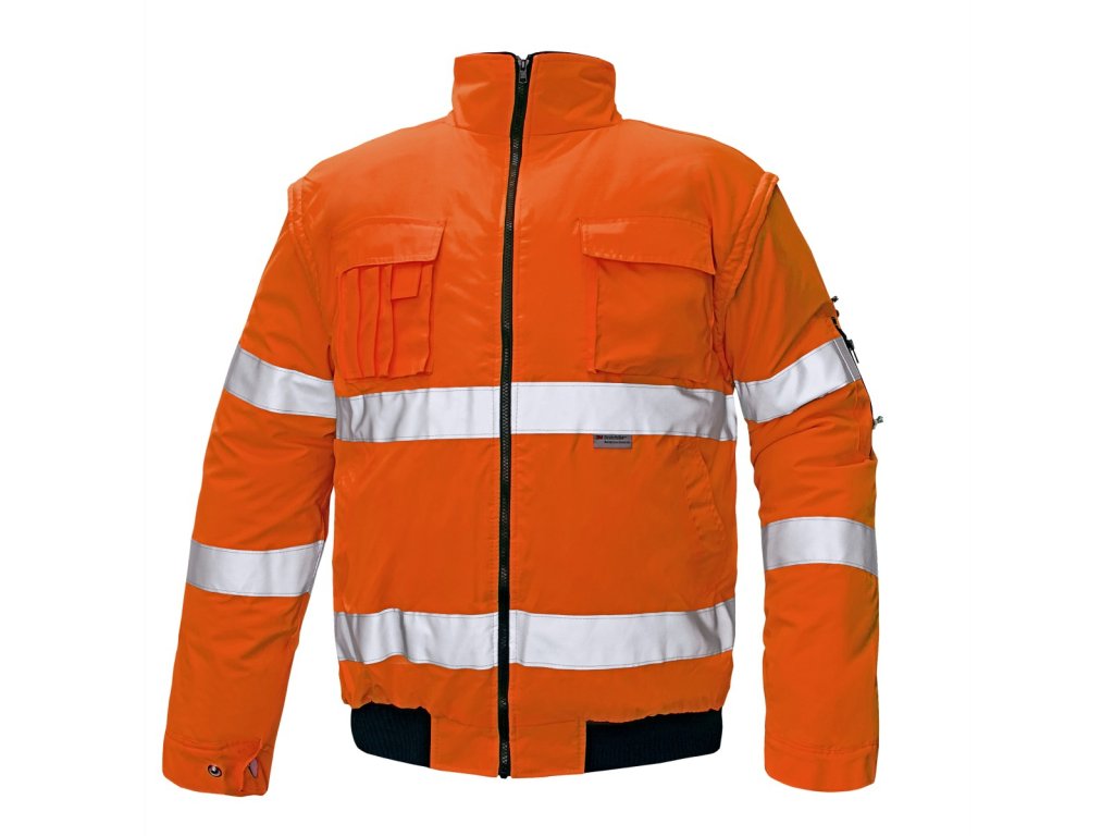 • Hi-Vis bunda 2 v 1 s reflexnými pruhmi • odopínateľné rukávy a samostatne nositeľná vesta • kapucňa integrovaná v golieri • podlepené švy • reflexné pásky 3M • vodeodolnosť tr. 3 podľa normy EN 343 a paropriepustnosť tr. 1 podľa normy