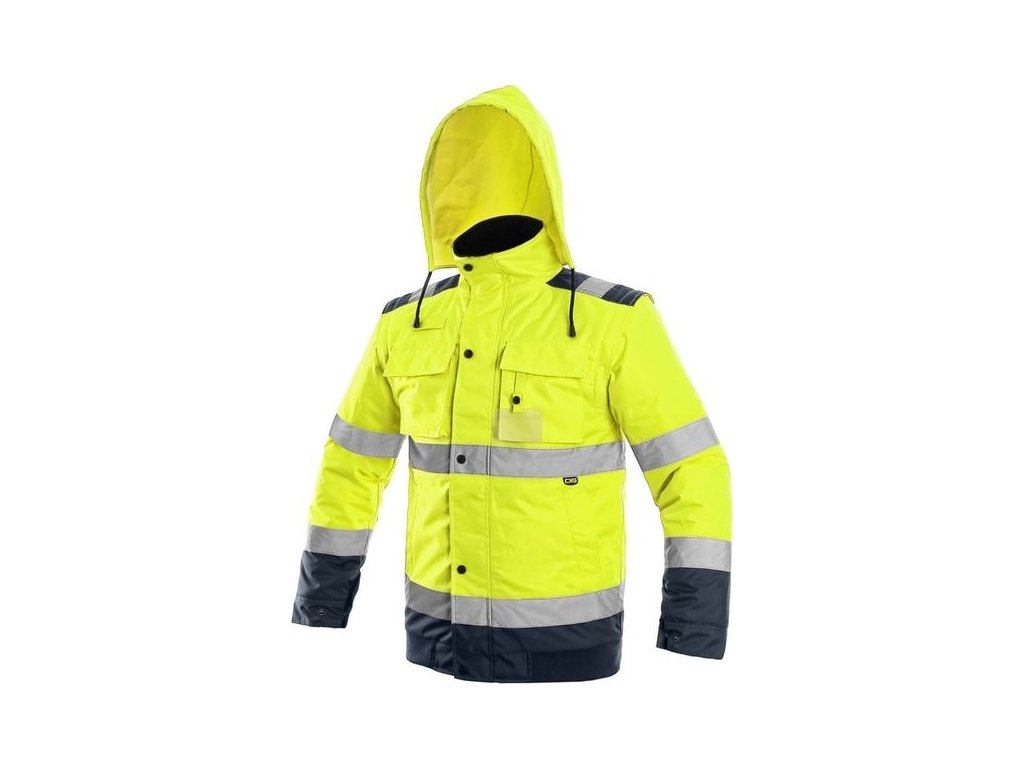Výstražná zateplená bunda do pása, 2v1, odolná proti vode a vetru, reflexné pruhy, lepené švy, zapínaná na zips krytý legou, odopínacie rukávy s regulovateľnými a vnútornými manžetami, kapucňa v golieri, vrecko 2 na suché zipsy, na ľavej strane pútko na prichytenie ID karty, na pravej strane slučka na rádiostanici, jedno vnútorné vrecko. Vnútri je zips pre jednoduchú aplikáciu výšivky na vonkajšej strane bundy.