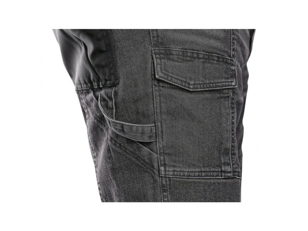 Pánske džínsové kraťasy, pás s pútkami na opasok a plastovým príveskom, 2 predné vrecká, 2 zadné vrecká z materiálu CORDURA, bočné multifunkčné vrecká, na pravom vrecku pútko pre kladivo.