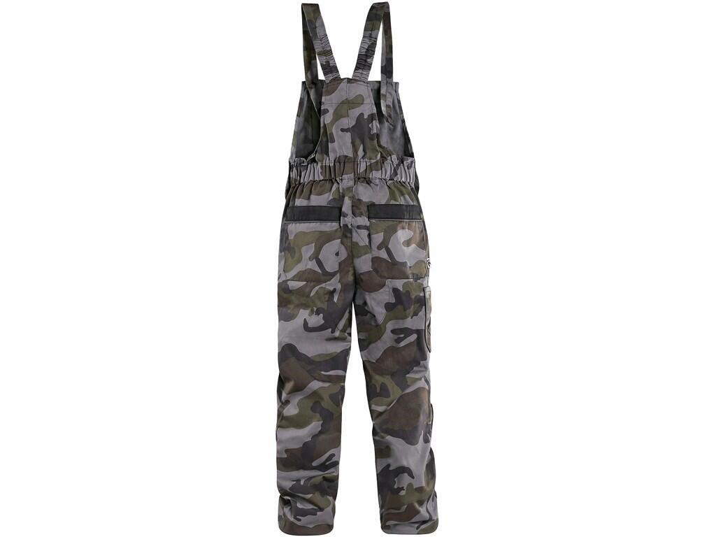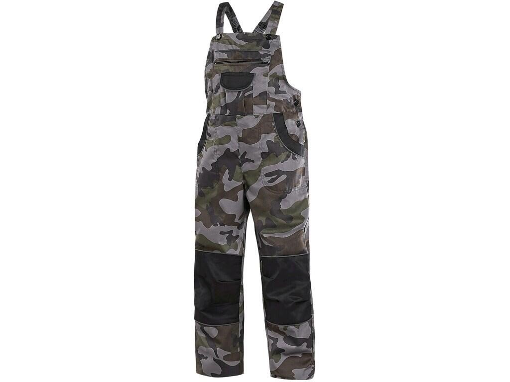 Detské maskáčové nohavice s náprsenkou, vybavené zosilnenými kolenami a sedom pre dlhšiu životnosť. Pás na gombíky, vzadu do gumy, traky s gumou vzadu, náprsné vrecko na zips s menším vreckom, predné aj zadné vrecká, bočné vrecko, reflexné doplnky.