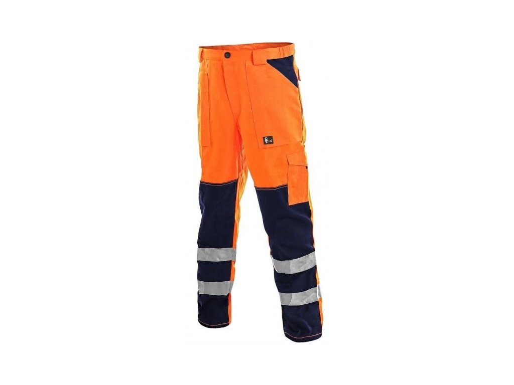 Pánske nohavice do pása, výstražné, pevný pás s gumou v bokoch, pútka na opasok, predné a zadné našité vrecká, bočné vrecko s vreckom na mobil, reflexné pruhy 3M.