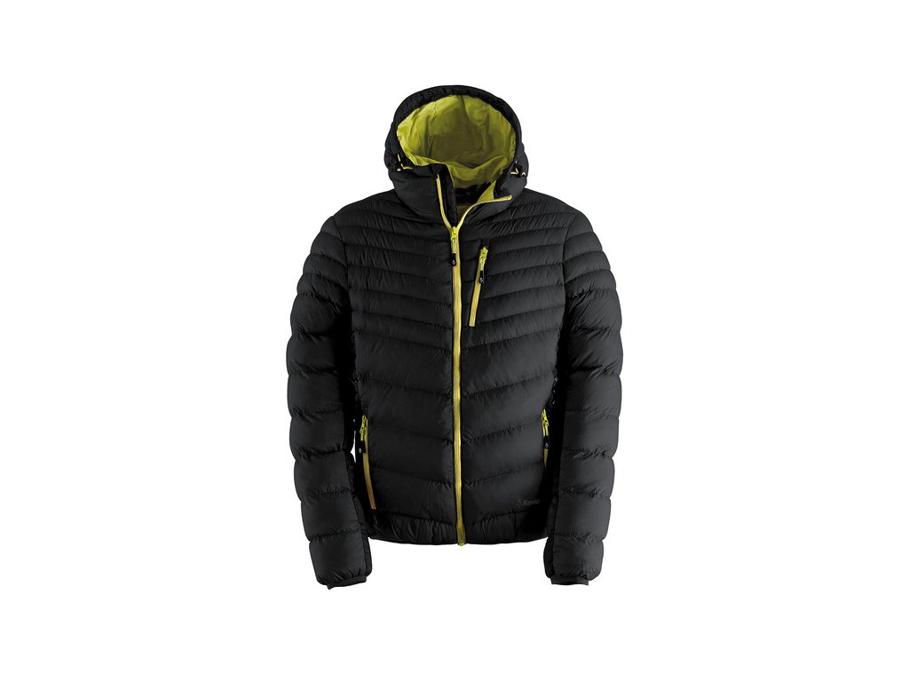 Bunda je čierna a má kontrastný zelený zips a vnútornú podšívku vrátane kapucne.